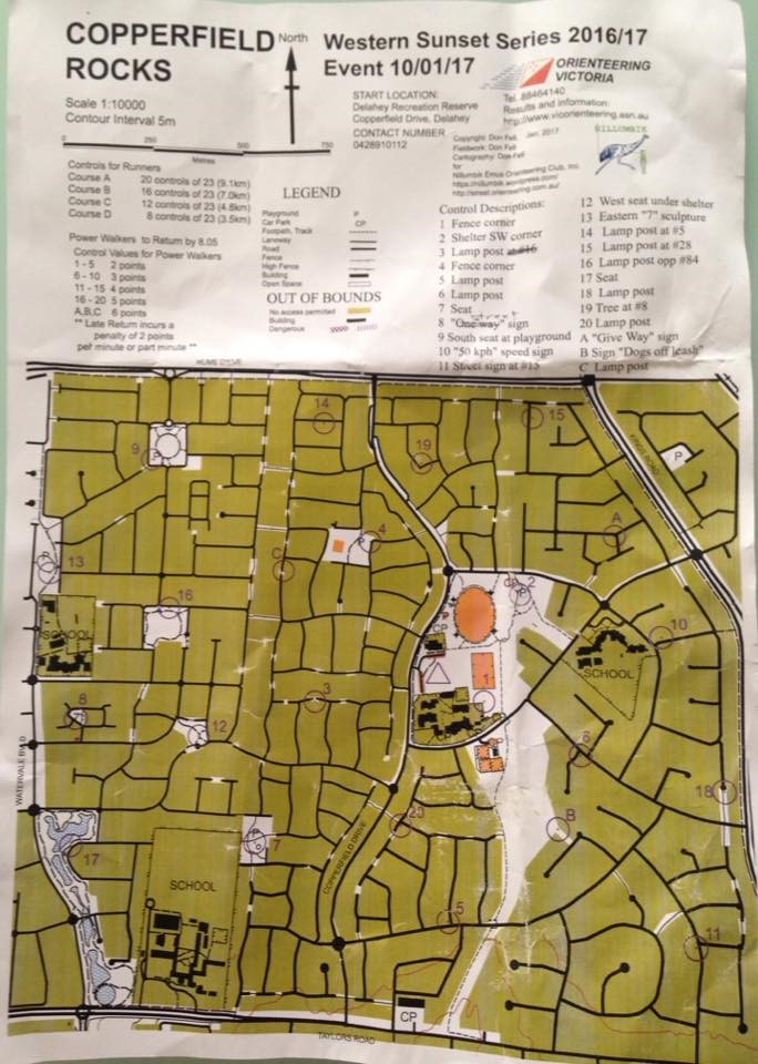 Anne Robinson wrote: An interesting new map “Copperfield Rocks” in Delahey for the Tuesday Western Summer series. Don Fell’s course setting provided more route choices than obvious at first glance and there were some close finishes and much comparison afterwards. The complex street network with pedestrian and bike access paths was a challenge in some ways but allows the locals to get out and about. Several orienteers commented on the numbers that were in the streets and parks and many gave us a friendly greeting. Not always the case!