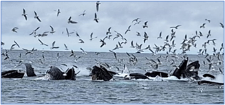 Ron has just arrived home safely after his sojourn in North America, including Alaska. “We were very fortunate to see these humpback whales bubble net fishing. Seagulls waiting for scraps.”