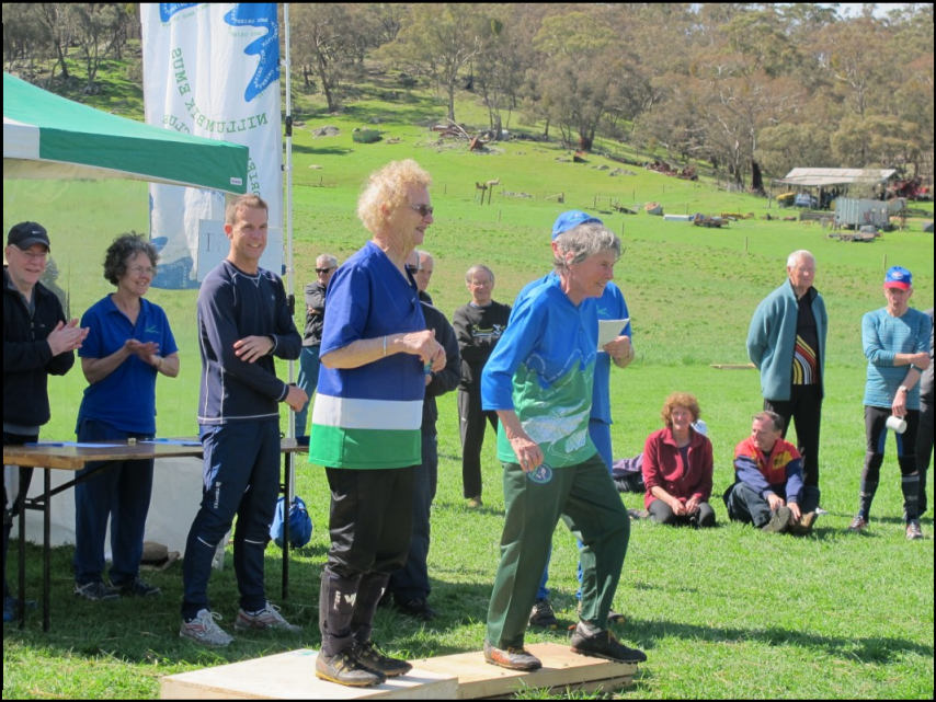 Sue Healy stepping forward to receive a medal at the Victorian Champs at Spring Gully near Castlemaine with fellow club member Joyce Rowlands also on the winners podium. Ron Frederick is making the presentations. Fiona Fell and Geoff Armstrong in the shelter and Bruce Arthur, OV President at the time, looking on.